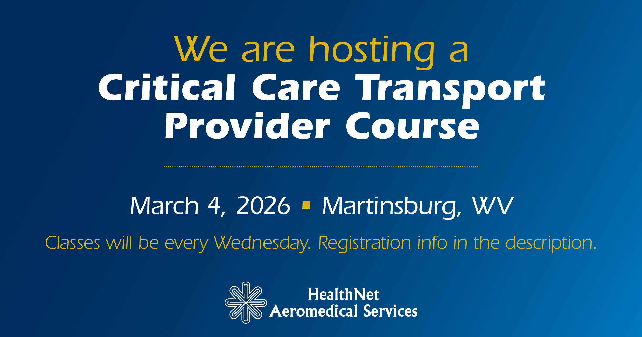 HealthNet Aeromedical Services will host a 12-week Critical Care Transport Provider course in Martinsburg. Classes will take place on Wednesdays.
